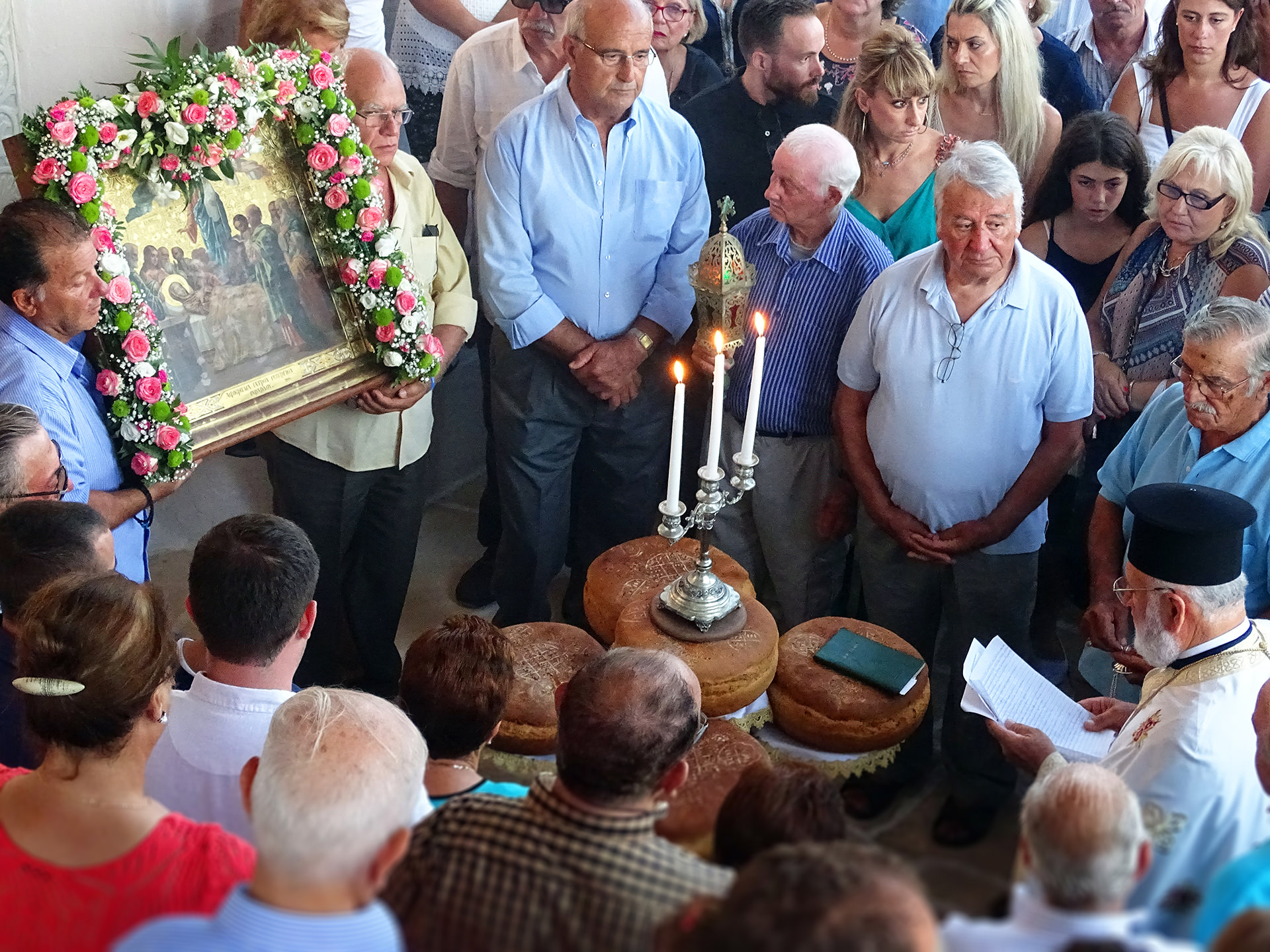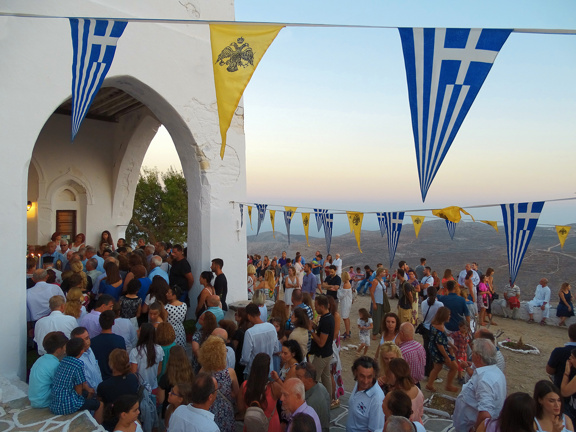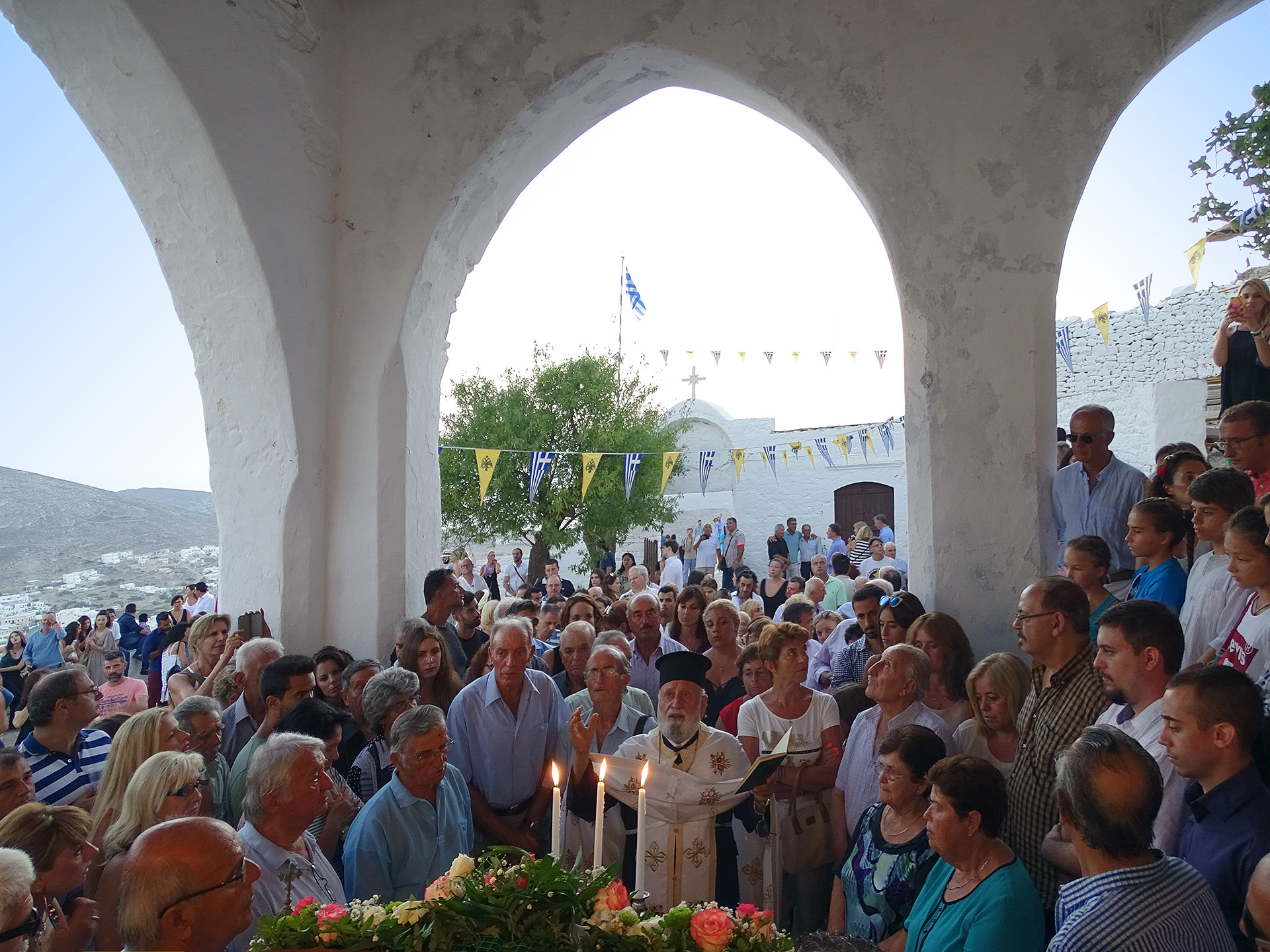 Η Γιορτή της Παναγίας στην πιο φημισμένη εκκλησία της Φολεγάνδρου η οποία είναι αφιερωμένη στην Κοίμηση της Θεοτόκου. Κτισμένη σε ένα βράχο πάνω από την Χώρα, δεσπόζει επιβλητική με το κατάλευκο χρώμα της στη θέση κάποιου αρχαίου ναού, του οποίου έχει χρησιμοποιηθεί οικοδομικό υλικό. Στον αυλόγυρο του ναού, όπως και στο εσωτερικό του ο επισκέπτης διακρίνει εντοιχισμένες αρχαίες επιγραφές και πολλές βάσεις από αγάλματα. Παλαιότερα ήταν καθολικό γυναικείας Μονής.Το σχήμα της είναι ορθογώνιο και ο τύπος της είναι μονόκλιτη βασιλική με πολλούς τρούλους. Διαθέτει επίσης και ψηλό κατάλευκο καμπαναριό.Όπως κάθε χρόνο έτσι και φέτος μετά το πέρας της τελετής στήθηκε μεγάλο γλέντι στην Πούντα με τοπικούς μουσικούς.